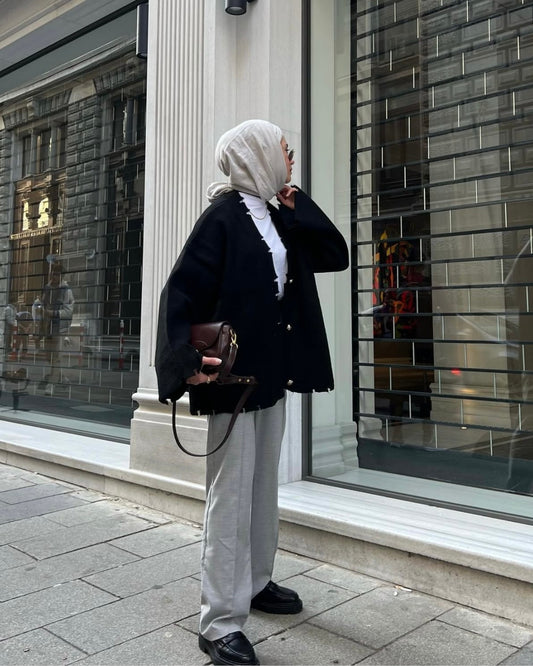Chunky Knit Jacket With Gold Buttons-Black